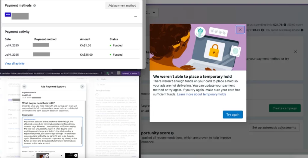 When a transaction is rejected, Meta applies a “rest” mechanism. If you click “Try Again” too many times in a short period, the system will consider it spam or a brute-force attack and continue to block the deduction. You should wait at least 24 hours for the system to reset its status before making the next attempt.